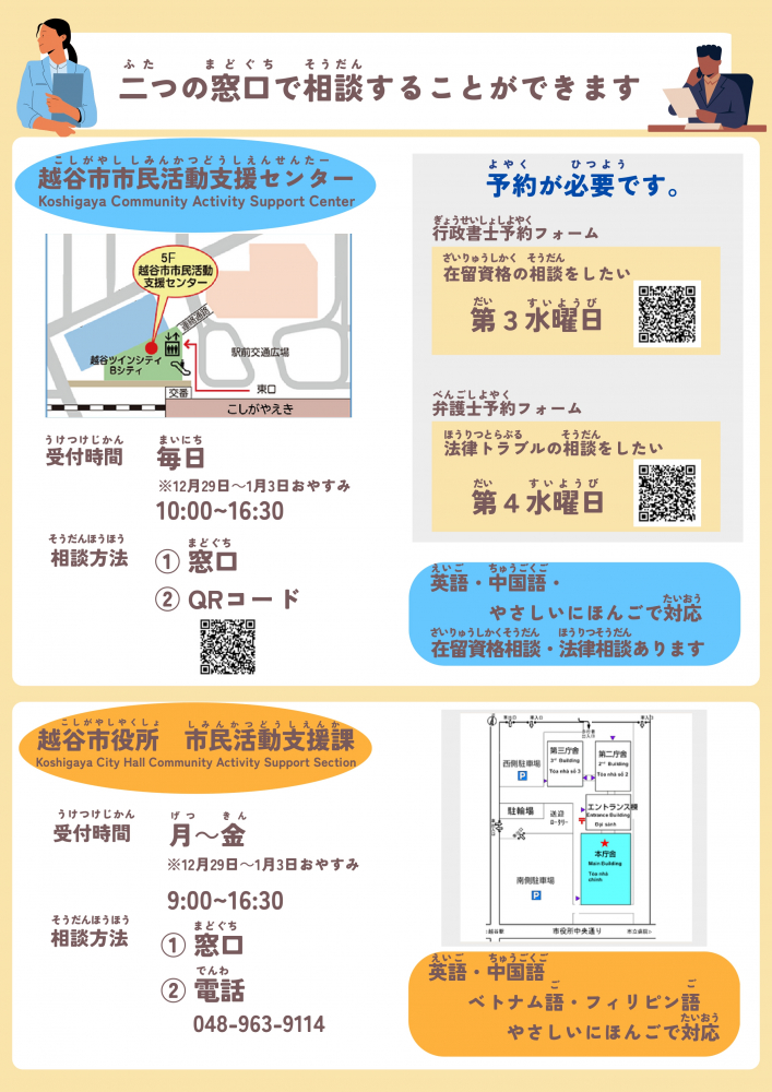 日本語教室、教育(入学・進学など)、生活全般(家庭ごみの分け方出し方、税金など)、日本人と外国人のトラブル、行政書士との在留資格相談(要予約・第3水曜日)、弁護士との法律トラブル相談(要予約・第4水曜日)