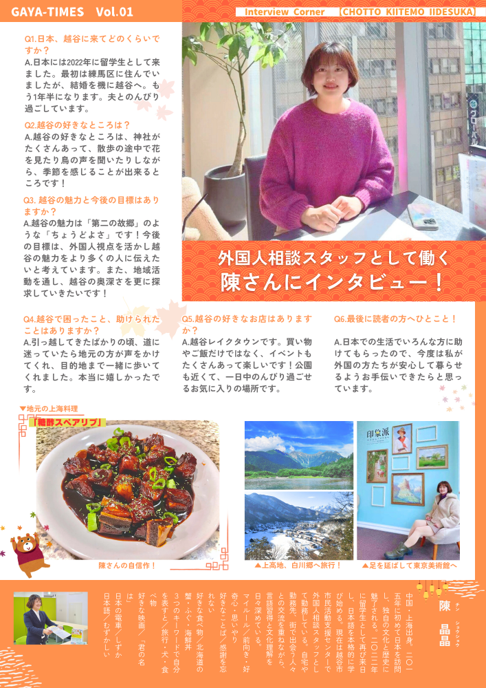越谷の魅力は “ひと” にある。 そう思った私たちは、 インタビュー誌 『GAYA TIMES』 創刊第一号を発行しました。 「こんな人がいたんだ!」 そんな発見がきっとあります。 ぜひ、のぞいてみてください。 ❤️2ヵ月に一度の無料誌です❤️