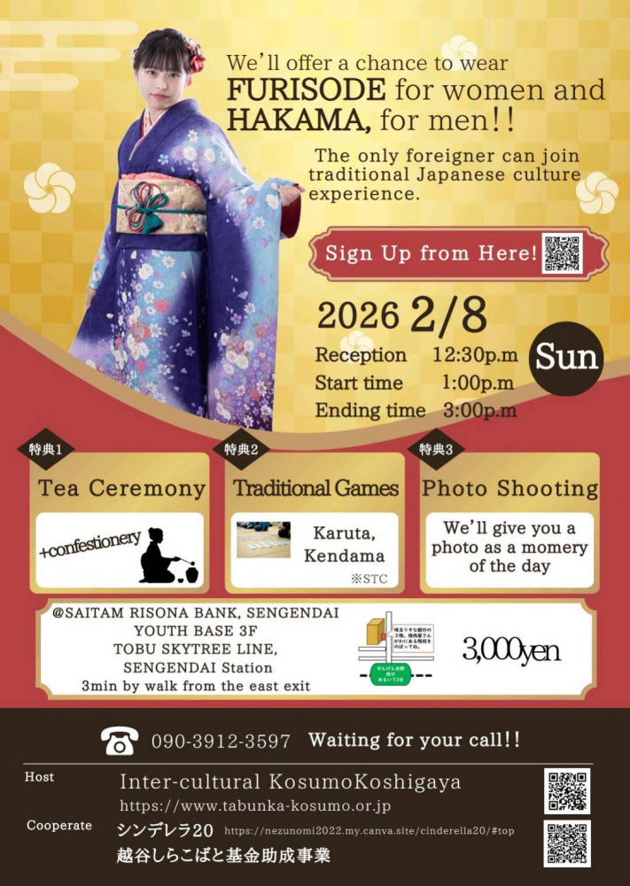 振袖の着付け、写真撮影、髪のセット、男性は袴体験